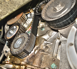 Ein Zahnriemen, auch Steuerriemen genannt, ist an der Stirnseite des Motors angebracht. Er wird von der Kurbelwelle angetrieben. Die Kraft der Kurbelwelle überträgt er über die Spannung einiger Umlenkrollen auf die Nockenwelle. Außerdem werden manchmal die Wasserpumpe oder Lenkhilfepumpe durch den Zahnriemen mitgesteuert. Der Zahnriemen wird einer enormen mechanischen, chemischen und thermischen Belastung ausgesetzt, und die Steuertrieb-Komponenten werden durch hohe Drehzahlen, Schwingungen und Temperaturschwankungen stark beansprucht. Verliert der Zahnriemen dadurch seine Spannung, überspringt einen oder mehrere Zähne oder reißt sogar, kann es schlimmstenfalls zum Totalschaden des Motors führen.